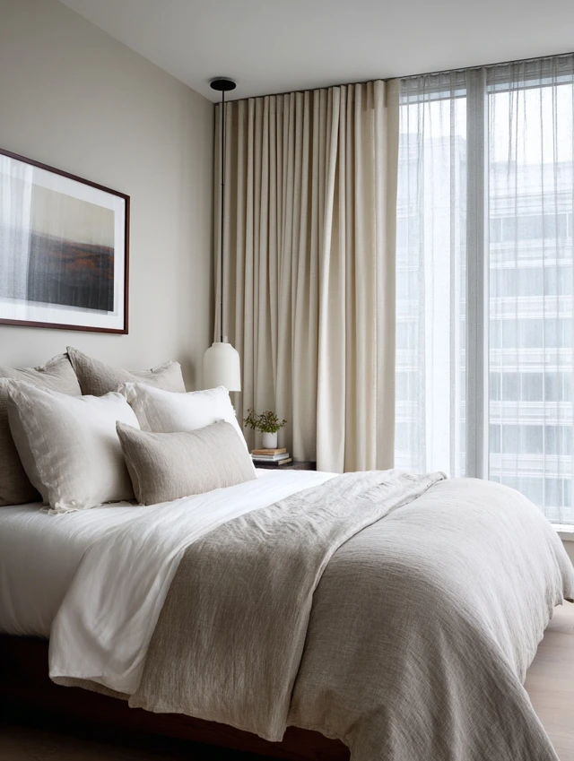 Texture replaces decoration: linen, cotton, light wood.